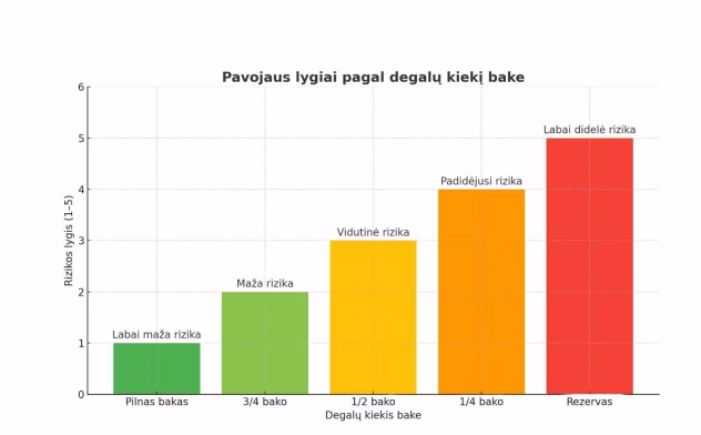 Specialistai rekomenduoja bake nuolat turėti bent ketvirtadalį jo talpos degalų. „Tai užtikrina stabilų kuro siurblio darbą, sumažina nuosėdų patekimo riziką ir suteikia laiko saugiai pasiekti degalinę net pasikeitus sąnaudoms“, – teigia V. Tonkich.
