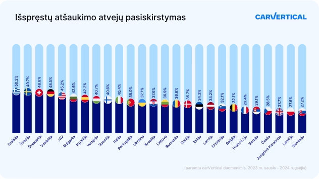 Iš visų „carVertical“ Lietuvoje tikrintų automobilių, 6,5 proc. buvo nors kartą įtraukti į gamintojų sudarytą remontui grąžintinų modelių sąrašą. Pagal šį rodiklį Lietuva rikiuojasi 14-oje vietoje iš 26 tyrime dalyvavusių šalių.