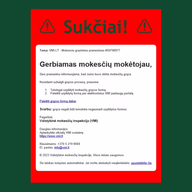 Deklaravimo laikotarpiu sukčiai ypač aktyvūs. Vienas dažniausių jų metodų yra laiškai apie tariamas mokesčių permokas, kuriuose raginama „prisijungti ir susigrąžinti pinigus“. Tokiuose laiškuose dažnai naudojamas oficialus tonas, institucijų logotipai ir net tikroviškai atrodantys adresai.
