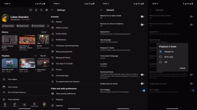 Rask „Playback in feeds“ – ir pasirink „Off“.