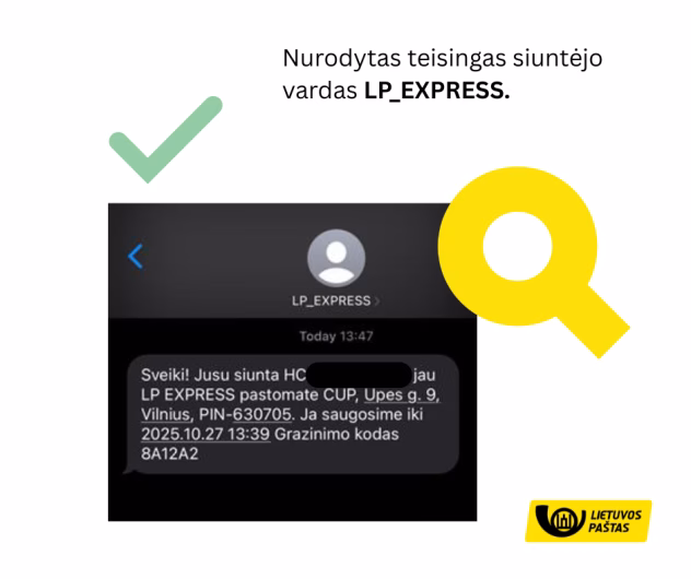 Svarbu pažymėti, kad tikruose Lietuvos pašto arba LP EXPRESS vardu siunčiamuose pranešimuose gavėjai nemato siuntimo numerio. Vietoje numerio gavėju nurodomas LPASTAS arba LP_EXPRESS.