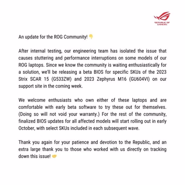 Nors pirmojoje išleidimo bangoje yra tik keletas 2023 modelių, „Asus“ teigia, kad galutiniai BIOS atnaujinimai visoms paveiktoms sistemoms bus pradėti diegti spalio pradžioje, o papildomi modeliai bus įtraukti vėlesnėse bangose.