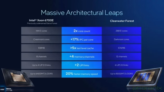 „Intel“ teigia, kad „Xeon 6+“ užtikrina 1,9 karto didesnį atminties pralaidumą dėl palaikomų DDR5-8000 modulių (palyginimui, „Sierra Forest“ palaiko DDR5-6400). „Clearwater Forest“ pasiūlys iki 576 MB trečiojo lygio talpyklos. Pasak bendrovės, „Xeon 6+“ yra 23 % energiją taupesni visose darbo apkrovose, palyginti su ankstesniais modeliais.