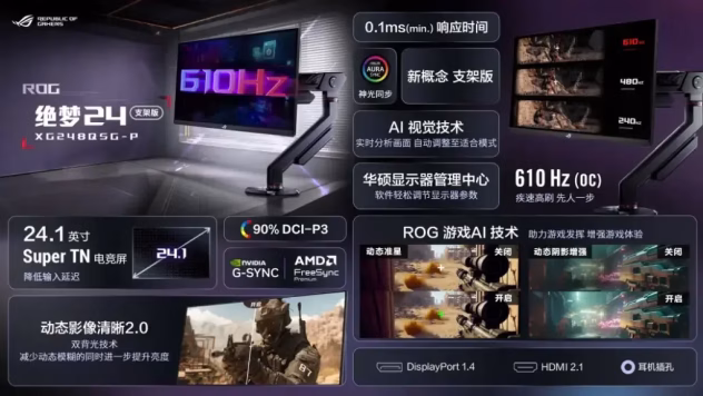 „Asus“ ne tik padidino atnaujinimo dažnį ir tuo baigė. Monitorius pasiūlys tris ekrano atsinaujinimo dažnius - tai 240 Hz, 480 Hz ir maksimaliai padidintu 610 Hz. Žaidėjams suteikiama lankstumo, priklausomai nuo jų sąrankos ar pasirinkto žaidimo. Čia rasime ir suderinamumą su „Nvidia G-Sync“ ir „AMD FreeSync Premium“.
