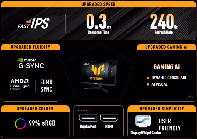 Naujasis monitorius skirtas žaidėjams, kurie nori aukšto atnaujinimo dažnio ir išmaniai valdomų vaizdo funkcijų už prieinamą kainą. Šis modelis turi „FAST IPS“ technologijos ekraną su 1 920 x 1 080 raiška. Jis palaiko 240 Hz atnaujinimo dažnį ir minimalų 0,3 ms atsako laiką.