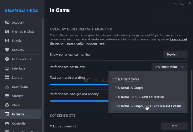 Vietoj paprasto FPS skaitiklio, „Steam“ dabar siūlo išsamią veikimo statistiką, kuris stebi kadrų dažnį kartu su CPU ir GPU naudojimu, taktiniu dažniu, temperatūra ir atminties naudojimu.