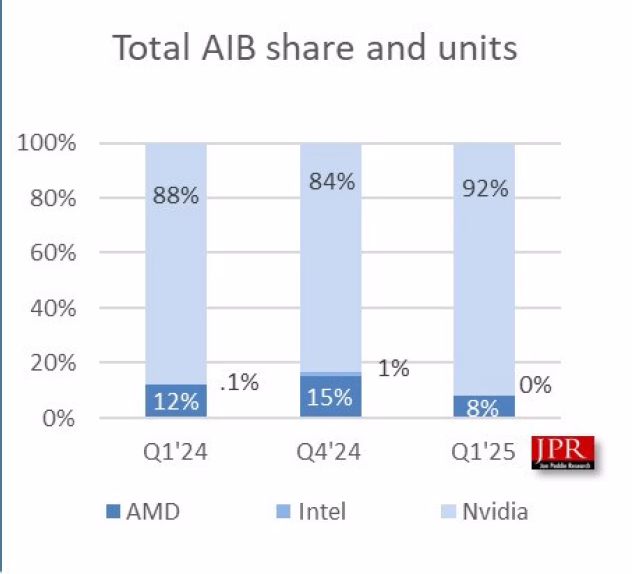 „Nvidia“ sugebėjo įtvirtinti lyderiaujančią poziciją padidindami savo rinkos dalį nuo 84 proc. iki triuškinančių 92 proc.. Labiausiai prie to prisidėjo RTX 5000 serijos vaizdo plokščių išleidimas.