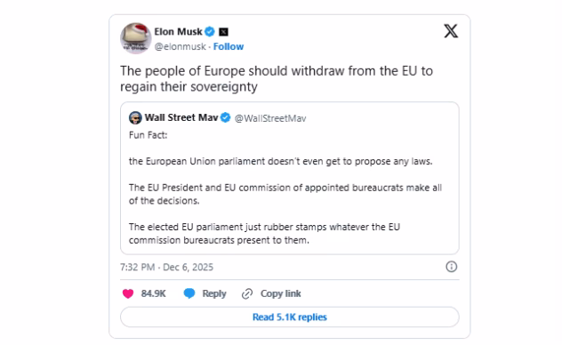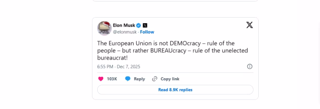 E. Muskas į baudą sureagavo agresyviai ir viešuose įrašuose ėmėsi kritikuoti visą Europos Sąjungą. Jis skelbė raginimus silpninti ar net panaikinti Bendriją, o šie pareiškimai pasiekė milžiniškas auditorijas. Tokia retorika sustiprino jo šalininkų mobilizaciją ir paskatino dar griežtesnius išpuolius prieš ES.