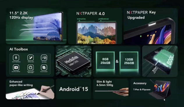 Planšetinis kompiuteris veiks su „MediaTek Helio G100“ mikroschemų rinkiniu ir turės 8 GB arba 12 GB operatyviosios (RAM) bei 256 GB vidinės atminties. „Nxtpaper 11 Plus“ modelio veikimą palaikys 8 000 mAh talpos baterija su 33W įkrovimo galimybe.