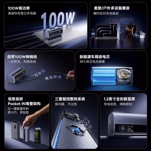Šios technologijos veikia kartu, kad neleistų akumuliatoriui perkaisti ir padidintų jo ilgaamžiškumą. Išorinė baterija pasižymi 100 W didelės galios išvestimi, leidžiančia greitai įkrauti nešiojamuosius kompiuterius, išmaniuosius telefonus ir kitus įrenginius. Jame įmontuotas ištraukiamas laidas užtikrina netvarką, nes jis išsitraukia, kai reikia naudoti, ir be vargo ištraukiamas, kai jo nereikia.
