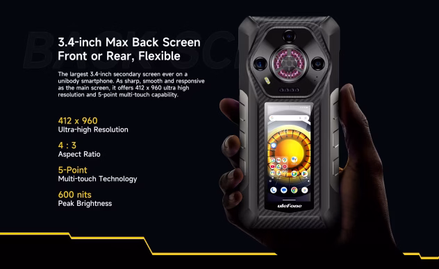 Visų pirma, priekinėje telefono dalyje rasime 6,95 colių įstrižainės ekraną su Full HD+ raiška ir 120 Hz atsinaujinimo. „Armor 30 Pro“ modelis taip pat turi ir papildomą ekraną nugarėlėje. Pastarasis pasižymi 3,4 colių įstrižaine ir suteiks analogiškas galimybes kaip ir pagrindinis ekranas.