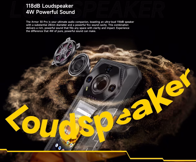 Dar viena išskirtinė „Ulefone Armor 30 Pro“ savybė – nugarėlėje esantis 4W galingumo garsiakalbis, o skleidžiamo garso lygis gali pasiekti net 118 dB. Jis yra 28 mm skersmens ir turi galingą 9cc garso ertmę. Šis derinys užtikrina sodrų, galingą garsą, kuris aiškiai ir įtaigiai užpildo bet kokią erdvę.