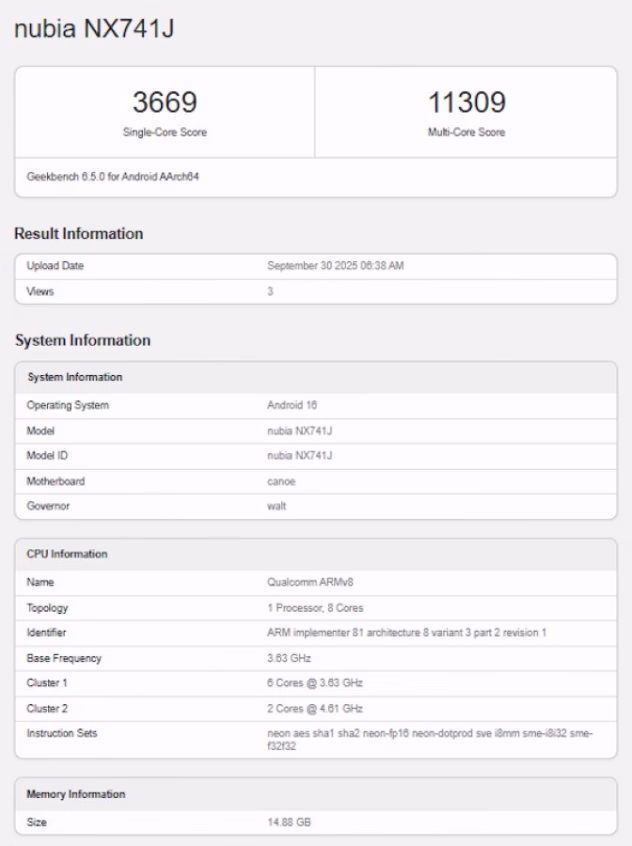 Sintetinių testų duomenų bazė patvirtina, jog išmanusis telefonas veiks su „Snapdragon 8 Elite Gen 5“ mikroschemų rinkiniu ir turės 16 GB operatyviosios (RAM) atminties. „Nubia Z80 Ultra“ vieno branduolio testuose rinko 3 669, o kelių branduolių – 11 309 taškus.