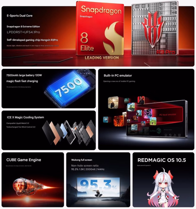 „Red Magic 10S Pro“ serijos telefonai veiks su „Qualcomm Snapdragon 8 Elite Leading Edition“. Įrenginių nugarėlėje rasime 50 MP raiškos vaizdo jutiklius naudojančią pagrindinę kamerą, o taip pat ir 50 MP plataus kampo objektyvą ir 2 MP makro kamerą.