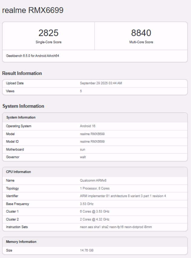 Čia jis žymimas RMX6699 modelio numeriu ir veikia su „Qualcomm Snapdragon 8 Elite“ mikroschemų rinkiniu. Vieno branduolio testuose prietaisas surinko 2 825, o kelių branduolių – 8 840 taškų. Telefonas taip pat turėjo 16 GB operatyviosios (RAM) atminties.