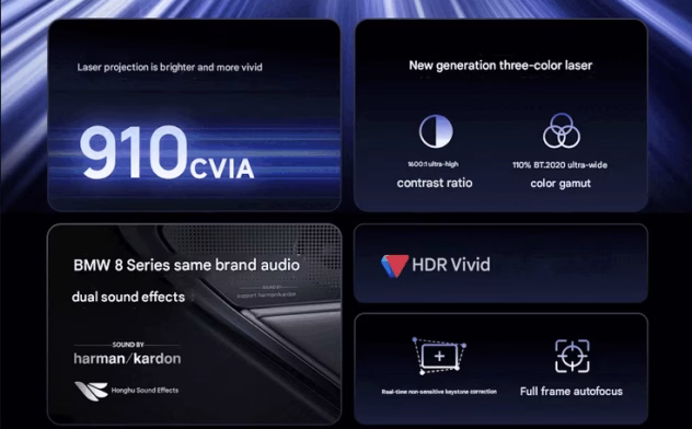 Naujasis vaizdo projektorius naudoja trijų spalvų lazerinį šviesos šaltinį, pasiekiantį iki 910 CVIA liumenų ryškumą. Tai užtikrina sodrias spalvas, tikrovišką vaizdą bei patikimą šviesumą. Projektorius palaiko Full HD raišką, turi 1600:1 statinį kontrasto santykį, bei 110 proc. BT.2020 spalvų gamos aprėptį su „HDR Vivid“ palaikymu.